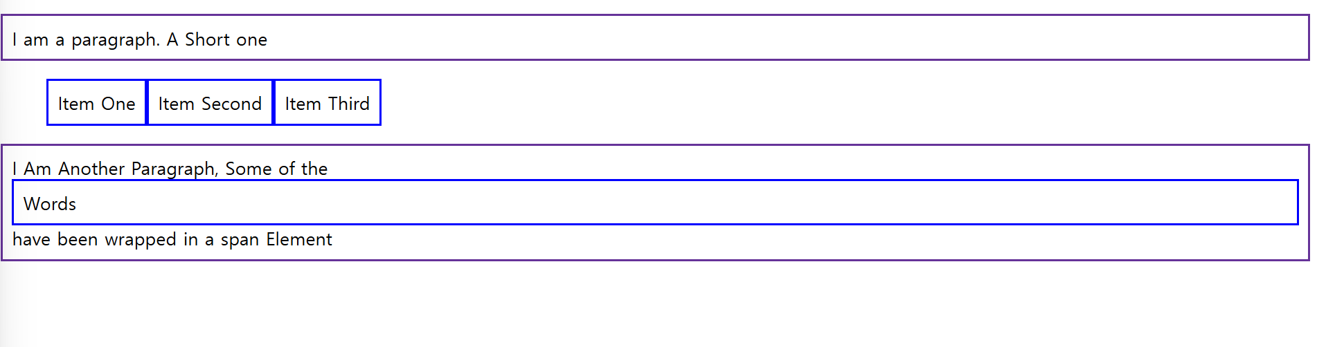 세 개의 서로 다른 HTML 요소가 있다고 가정하며, 외부 디스플레이 요소는 모두 block입니다. 첫 번째 단락은 CSS에 테두리가 추가된 단락으로 브라우저는 이걸 block box로 렌더링하며 단락은 새 줄에서 시작되고 확보된 너비 전체까지 확장될 것입니다.