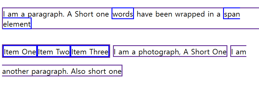 마지막으로 display:inline으로 설정된 두 단락이 있습니다. 인라인 플렉스 컨테이너와 단락은 모두 하나의 인라인에서 하나로 진행하지 블록 수준 요소처럼 표시하기 위해 새 줄로 행갈이를 하진 않습니다.