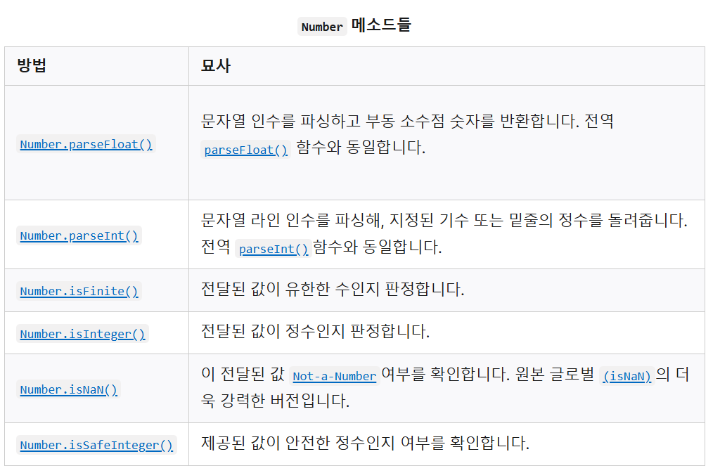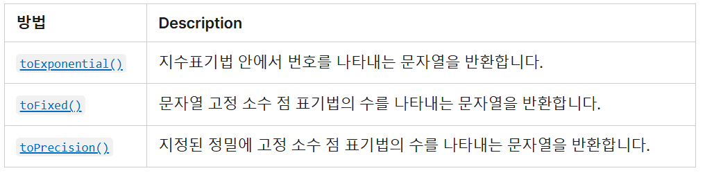 Number 프로토 타입은 다양한 Number 객체에서 정보를 검색하는 메소드를 제공합니다.