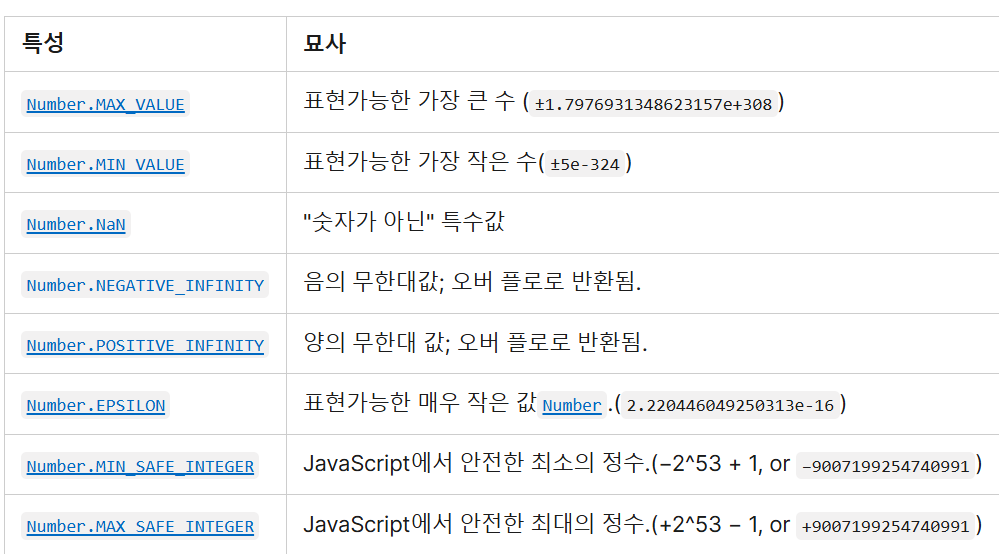 Number 내장객체는 최대값, not-a-number, 무한대와 같은 숫자 상수를 위한 속성들이 있습니다.