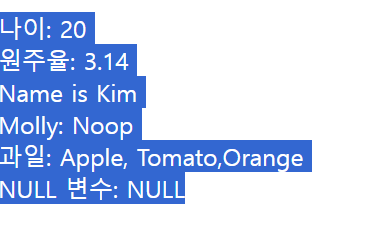 echo "NULL 변수: " . var_export($nullVariable, true) . "<br>";