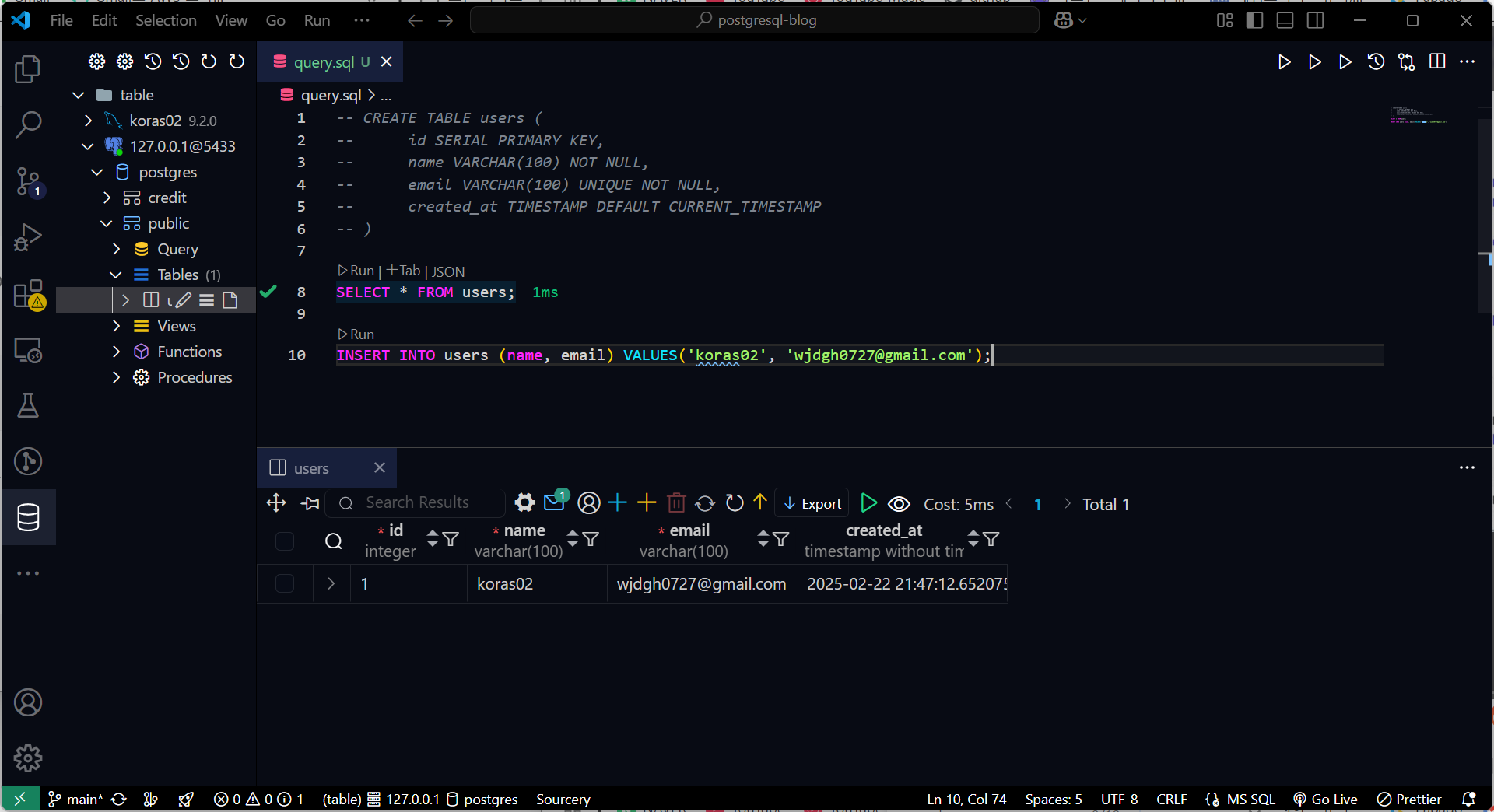 vsCode에 sql 파일에 마우스를 가져가면 Run 버튼을 클릭해봅니다 그리고 psql테이블이 생성되었는지 확인해봅니다.